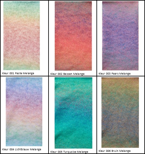 Kleur 001 Pastel Melange, Kleur 002 Bessen Melange, Kleur 003 Paars Melange, Kleur 004 Lichtblauw Melange, Kleur 005 Turquoise Melange, Kleur 006 Bruin Melange